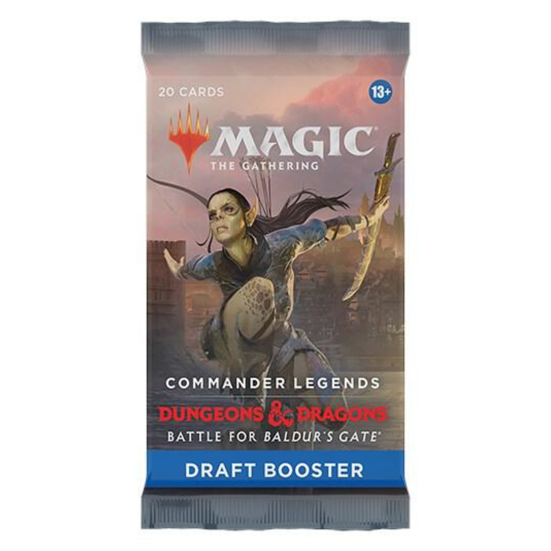 Draft a Commander Deck in the world of Dungeons & Dragons. The Commander Legends: Battle for Baldur’s Gate Draft Booster Box contains 24 Commander Legends: Battle for Baldur’s Gate Draft Boosters. Each Draft Booster contains 20 Magic cards and 1 token/ad card, with a combination of 1–4 card(s) of rarity Rare or higher (2: 37%; 3: 6%; 4: <1%), 3–6 Uncommon, and 13–15 Common cards. 1 card of any rarity is Traditional Foil. Traditional Foil Borderless Mythic Planeswalker in <1% of boosters.